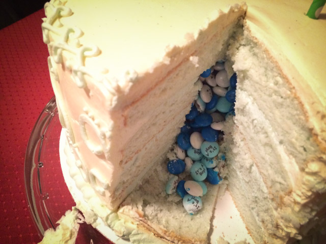 On January 18th, we had both families over for dinner. In excitement, we cut the cake together. The cake flowed with blue M&M's.