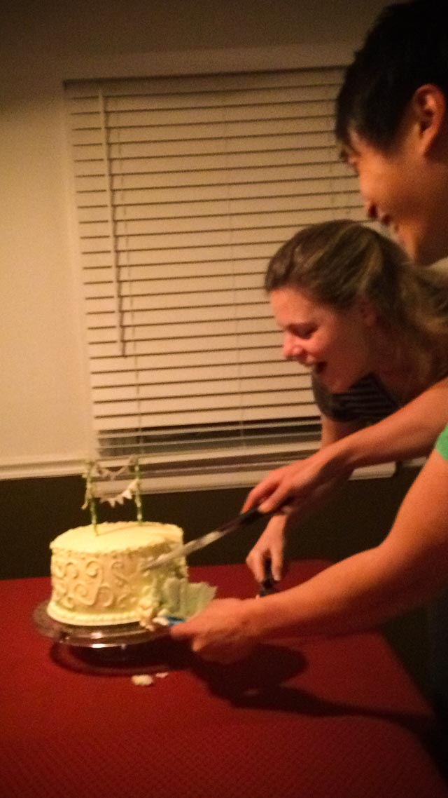On January 18th, we had both families over for dinner. In excitement, we cut the cake together. The cake flowed with blue M&M's.