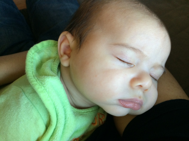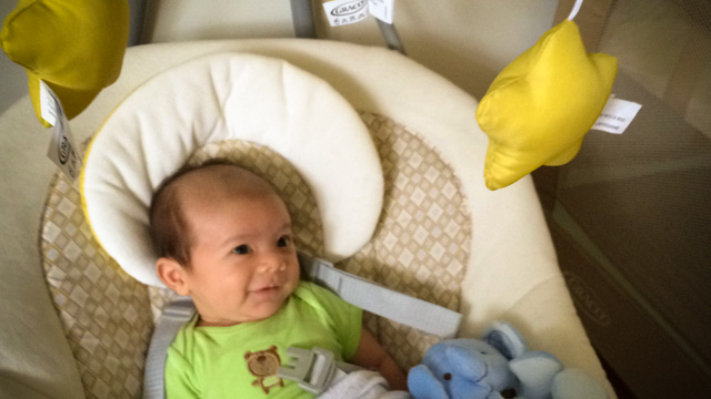 His first smile at three weeks old was in the baby swing while Jian was playing with him.